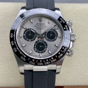 The Rolex Daytona 116519 1:1 Superclone quality with a silver dial and rubber strap.