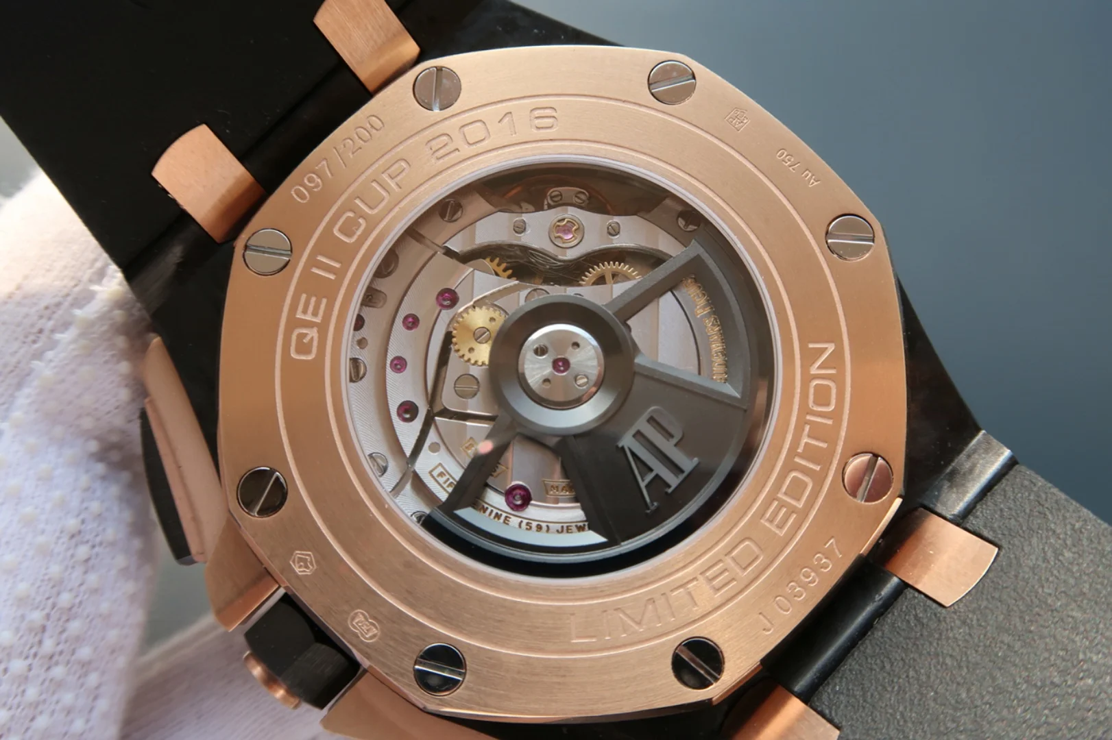 Movement: SWISS ETA 25J Automatic Chronograph Movement at 28800 vph with second at 12 and working regulator Decoration: Platinum plated movement plate and rotor which are made according to the genuine movement, the best looking AP Calibre 3126 Movement Clone at the moment.