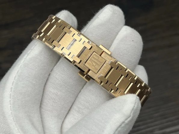 Crafted in **rose gold-plated 904L stainless steel**, this model maintains durability while showcasing a luxurious gold finish. The integrated bracelet is finished with both polished and brushed surfaces, delivering the same sharp lines and refinement as the authentic Royal Oak.