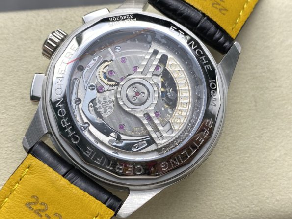* Type: Breitling Manufacture Caliber B09 (or relevant manual-winding chronograph caliber being replicated). Manual-winding chronograph movement.