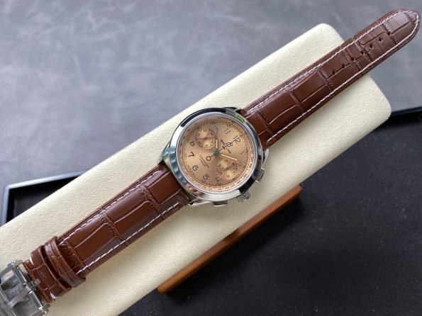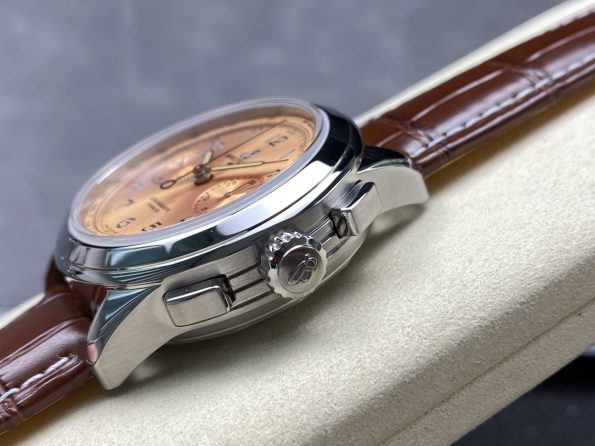 * A classic and elegant chronograph with a vintage-inspired design. The salmon dial adds a unique and stylish touch to this timeless timepiece.