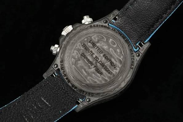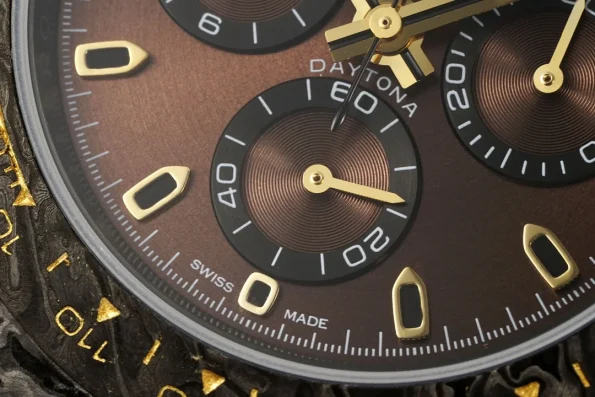 Daytona is a high-end watch that is made with premium materials and features a unique design. It is powered by a Swiss automatic movement and has a 44mm case made of carbon fiber. The dial is black with white accents and features a chronograph function. The watch also has a date window and a water resistance of 50 meters.