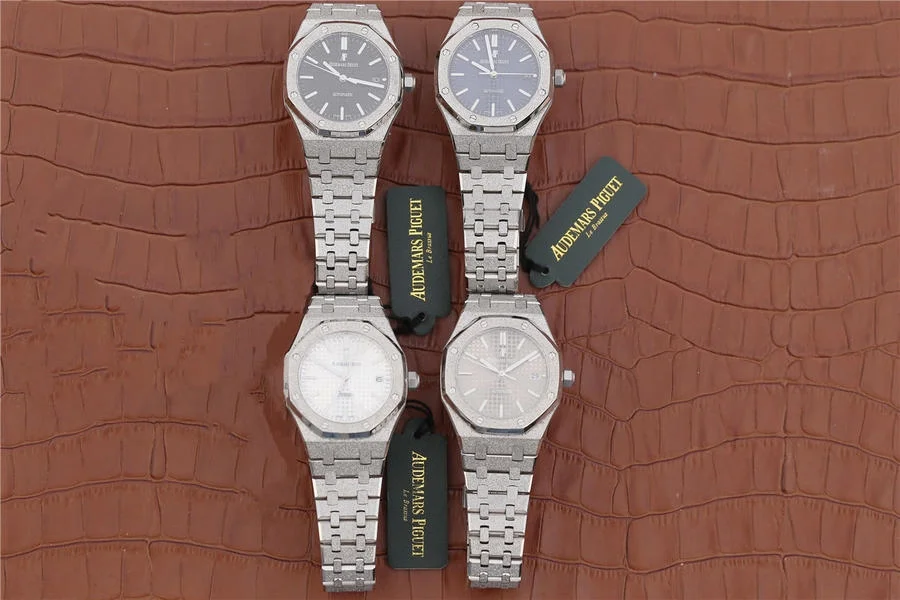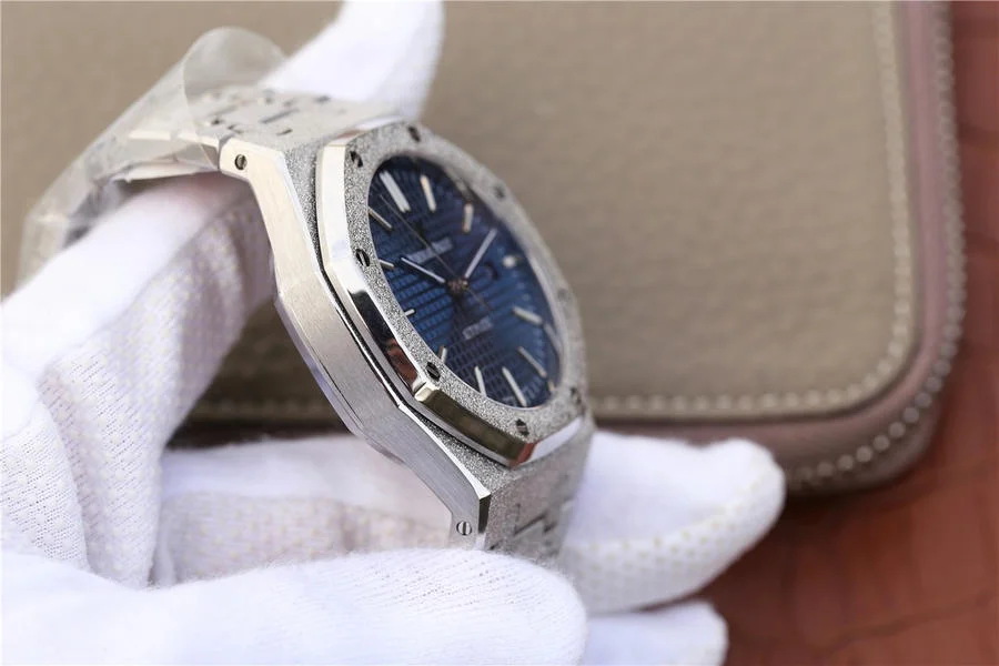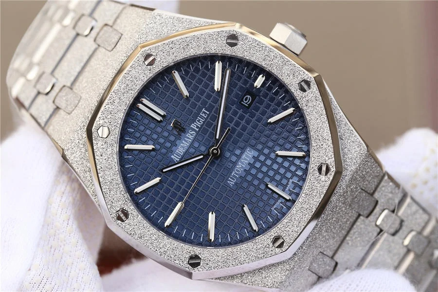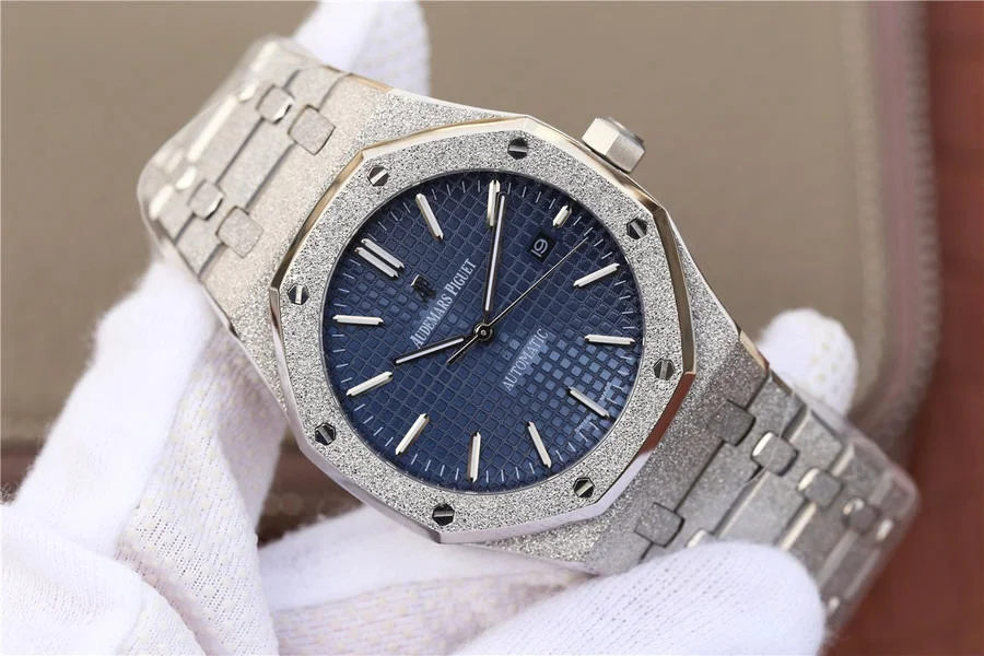 Royal Oak Series Diameter: 37 mm Case Thickness: 9.8 mm Dial Material: Palladium dial, engraved “Tap Grandisserie” large plaid decoration, with white gold fluorescent stereoscopic timepiece and Royal Oak pointer mirror material: anti-glare processing sapphire crystal glass mirror. Waterproof 50M with 2 Year warranty.