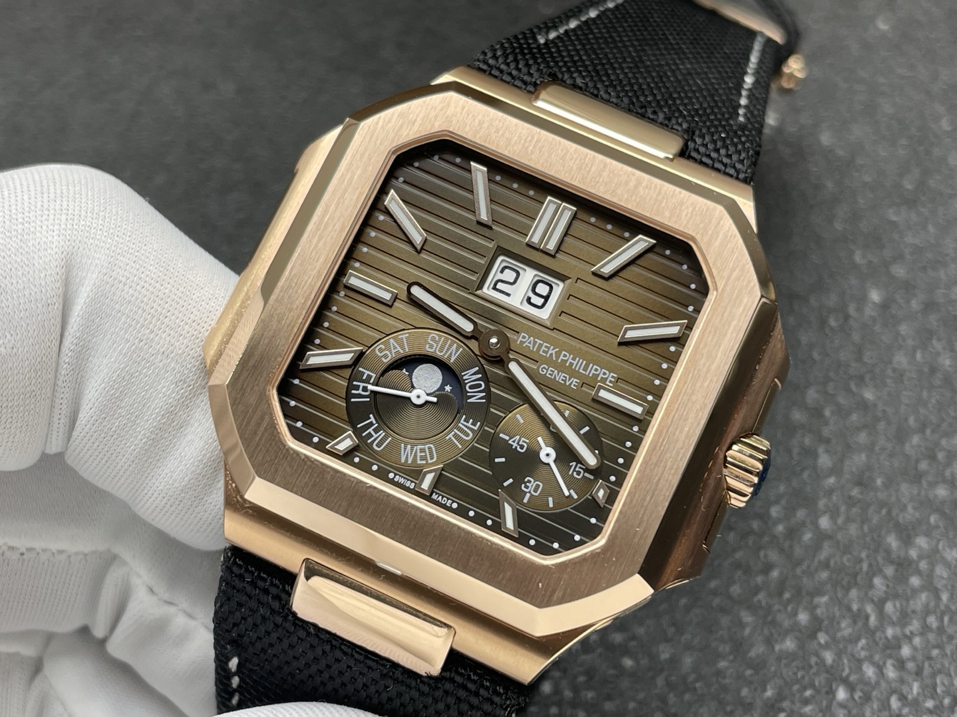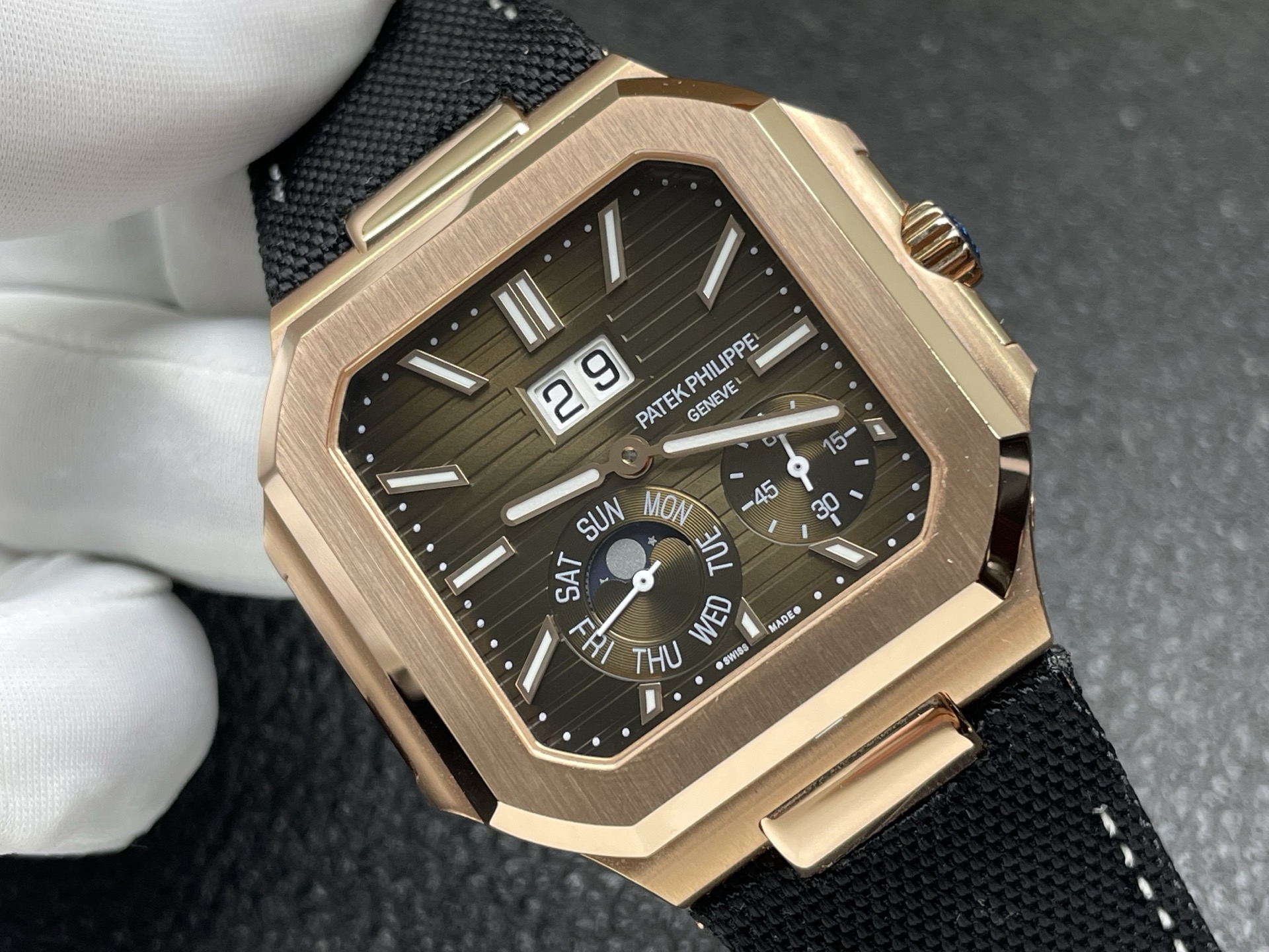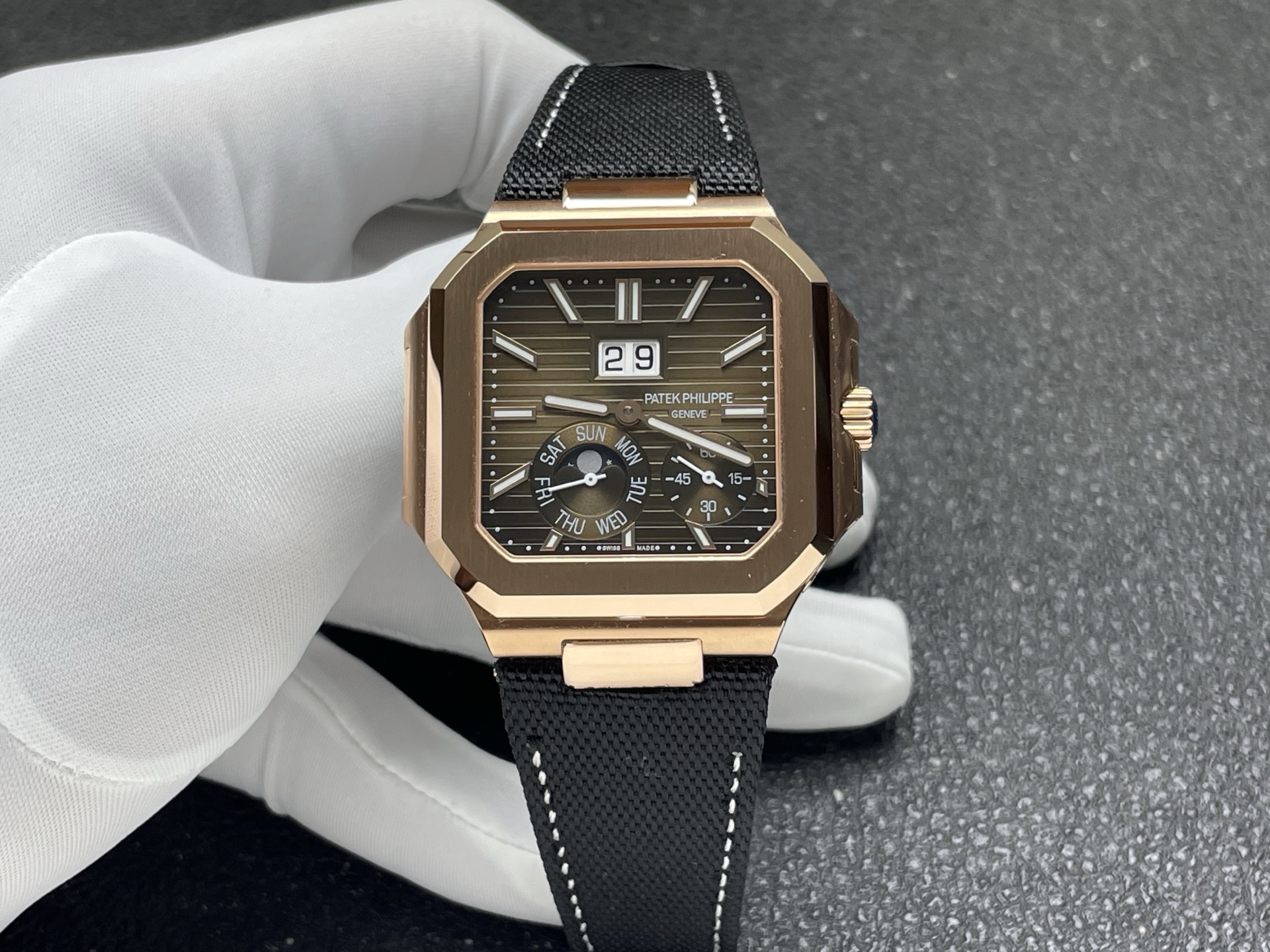 A refined 1:1 superclone of the platinum 5822P featuring instantaneous grand date, day display, and moonphase — engineered with full functionality and sleek proportions.