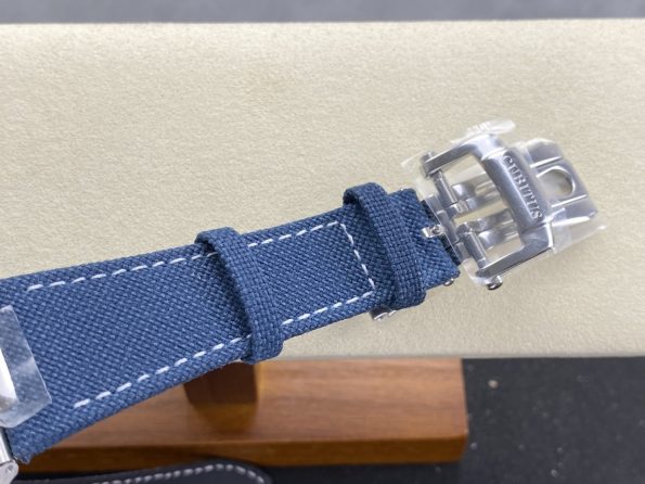 Dial: Blue horizontal-striped dial with applied indexes and luminous dauphine hands