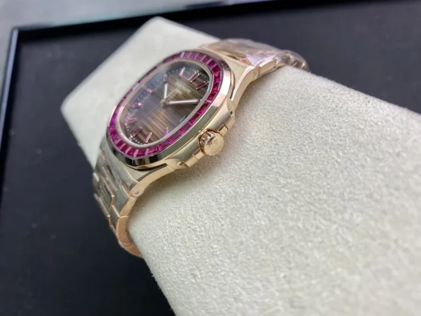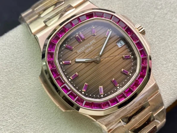 Patek Philippe Nautilus 5723 1:1 Superclone modified with rubies 18k gold wrapped is a unique and eye-catching timepiece. It features a 40mm stainless steel case with an Olive Green dial , a bezel set with rubies and wrapped in 18K Gold. The hands and hour markers are also made of rubies, and the watch is powered by the Patek Philippe Caliber 324 S C automatic movement.